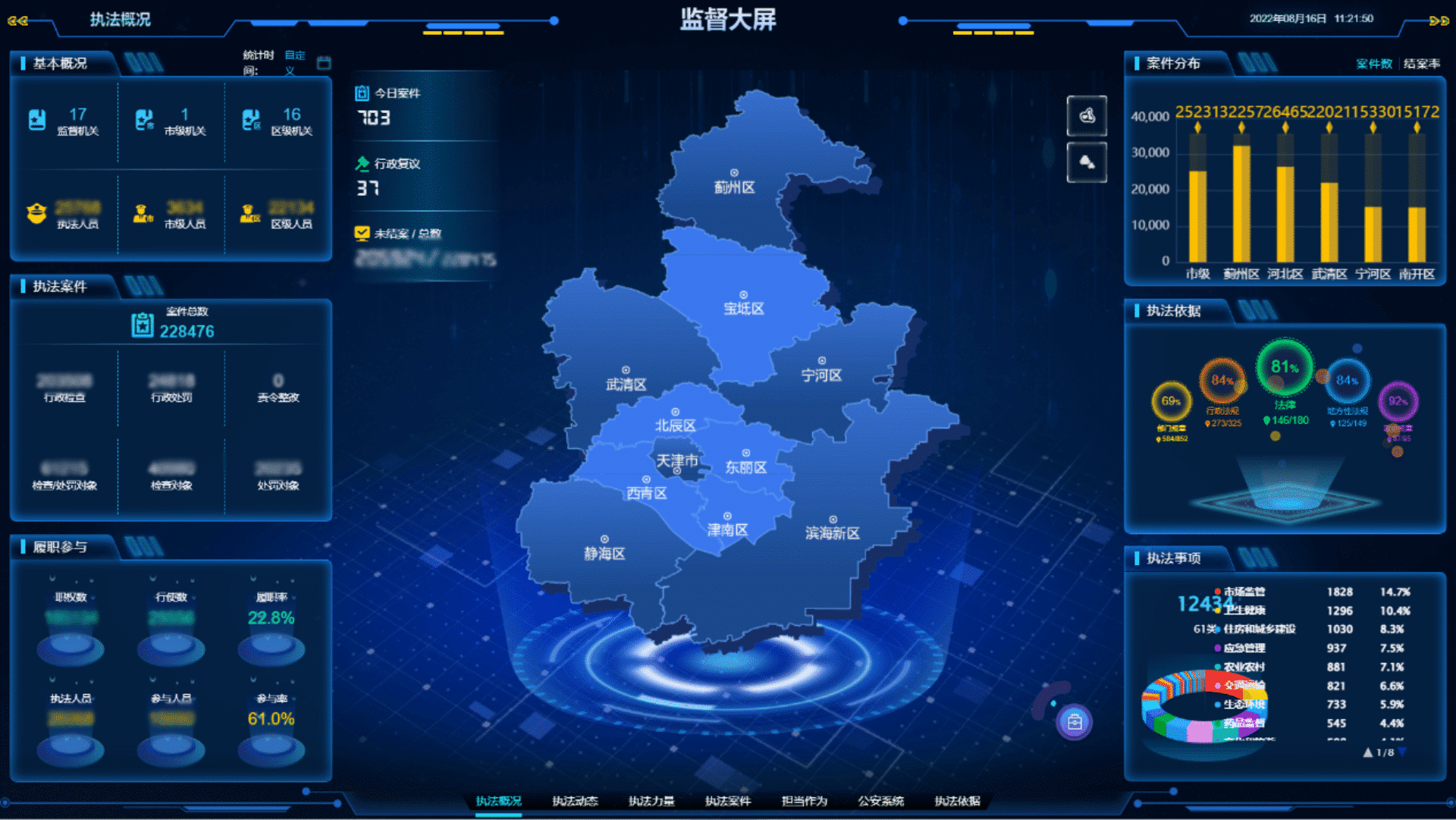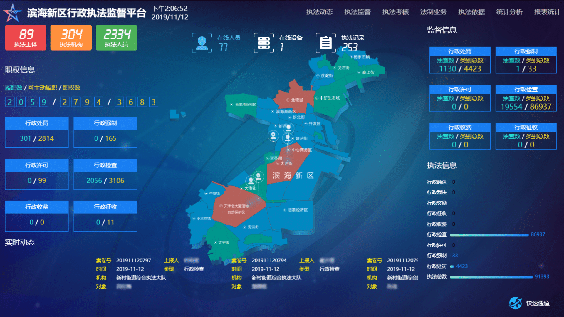 即刻了解天津市濱海新區執法監督平臺依托互聯網+、大數據、云計算等現代信息化技術,為天津濱海新區開發建設了集執法辦案、執法監督、法制審核、法制業務等功能于一體的“濱海新區行政執法監督平臺”,實現了全區行政執法工作網上開展、執法文書網上制作、執法監督實時開展、考核結果自動生成。后期按照推行行政執法三項制度試點工作的要求,在平臺原有功能基礎上,進一步拓展了系統功能。依靠此平臺助力天津濱海新區不斷提高依法行政的能力和水平。