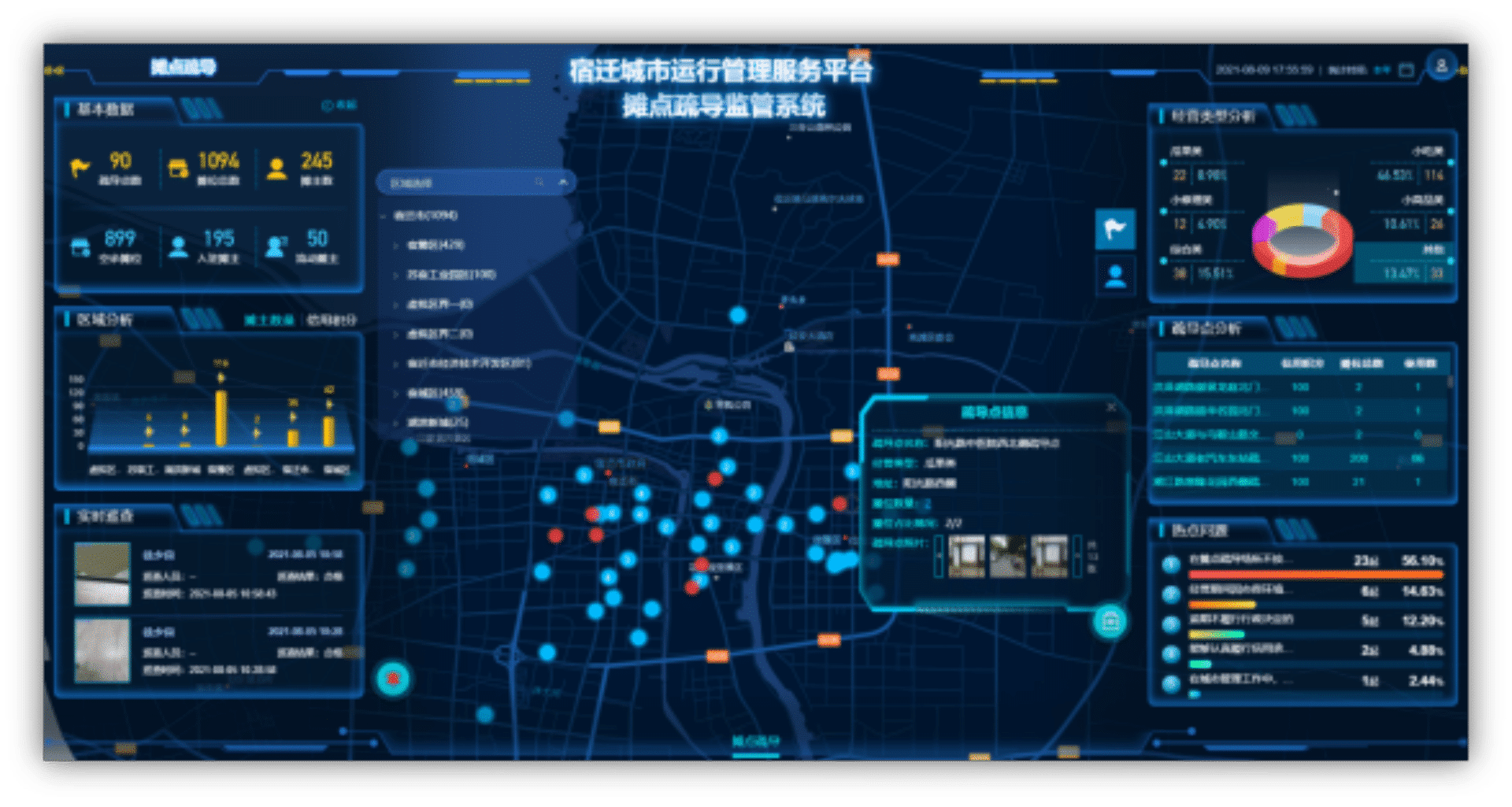 即刻了解為貫徹習近平總書記關于提高城市科學化、精細化、智能化管理水平的重要指示精神,宿遷市攤點疏導監管系統立足于全市建立統一管理的疏導點、攤位、攤主信息庫,采用“疏堵”結合的方式,明確管理主體、負責人、疏導點經營類型等信息,形成統一管理的電子臺賬,便于規范流動攤販日常經營活動區域,實現流動攤販定點經營的精細化管理。