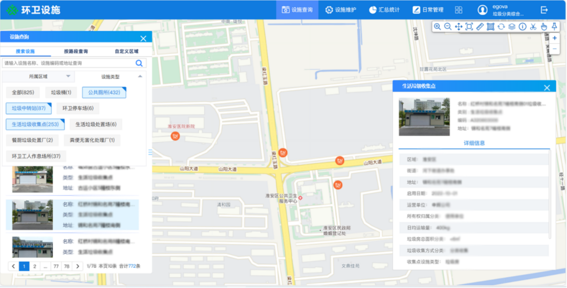 即刻了解實地調查淮安市200平方公里城區內垃圾中轉站、餐廚垃圾處置場、生活垃圾收集點、環衛停車場、公共廁所等11類城市環衛設施,了解其運行的基本能力和運行狀態,拍攝照片、視頻、全景等素材再現實況,構建環衛設施數據庫,為環衛日常管理提供基本數據支撐。