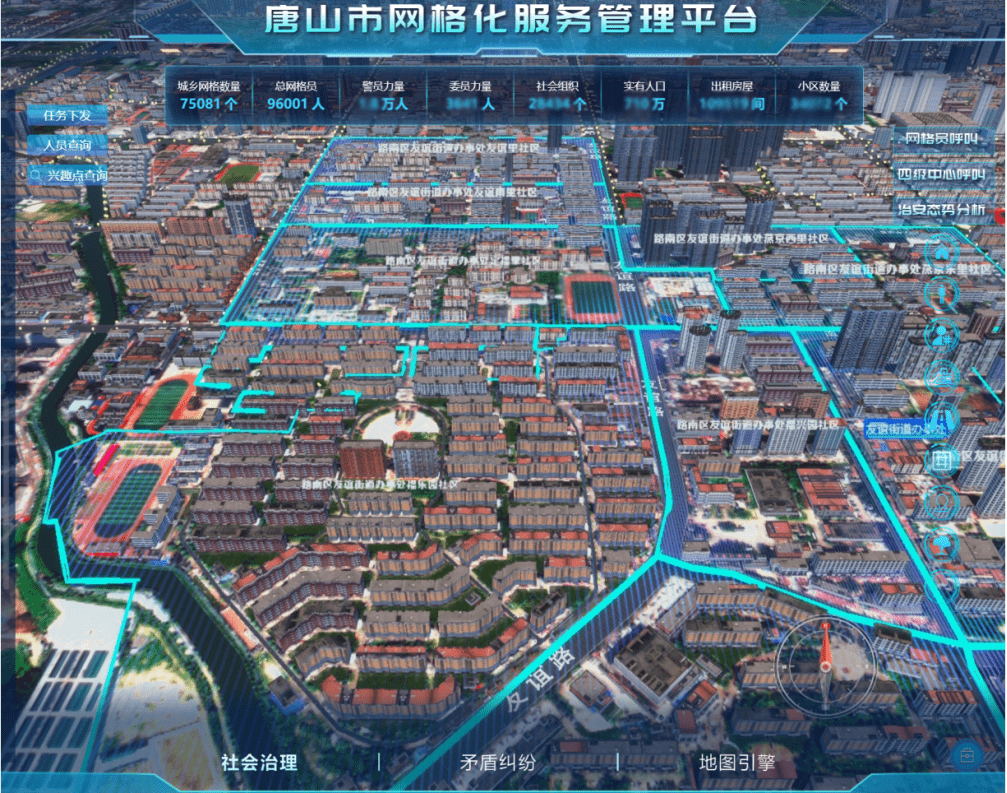 即刻了解依托“CIM+網格化”的方式,整合部件、地理編碼、網格、人口、房屋、組織機構等因素,完成全市13472平方公里范圍內18個區、249個街鎮、6338個社區、15557個基礎網格和78499個單元網格的劃分工作,實現“人地物”在三維GIS平臺中互聯互動、決策分析,為實現“小事不出村、大事不出鄉、矛盾不上交”,打造夜不閉戶的平安唐山提供可靠數據支撐。