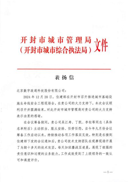 近日,數字政通收到來自開封市城市管理局的表揚信,充分肯定了公司在城市基礎設施生命線安全監管平臺中的專業能力與服務質量。這不僅是對數字政通深耕城市管理領域二十余年的高度認可,也是激勵我們再攀新高的前行動力。